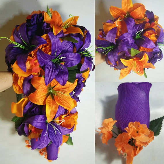 Purple Orange Rose Tiger Lily Cascading Bridal Wedding Bouquet Etsy