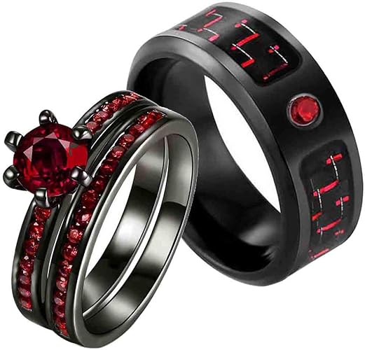 Mensring Couple Rings Black Gold Filled Round Red Cz Womens