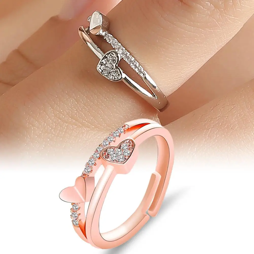 Women Ring Double Heart Hollow Band Rhinestone Inlaid Open Finger