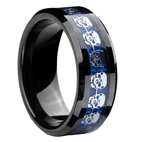 8mm Black Blue Tungsten Carbide Ring Silver Skull Skeleton