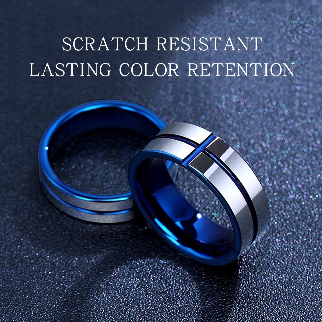 7mm Mens Wedding Band Blue Cross Line Plated Groove Tungsten
