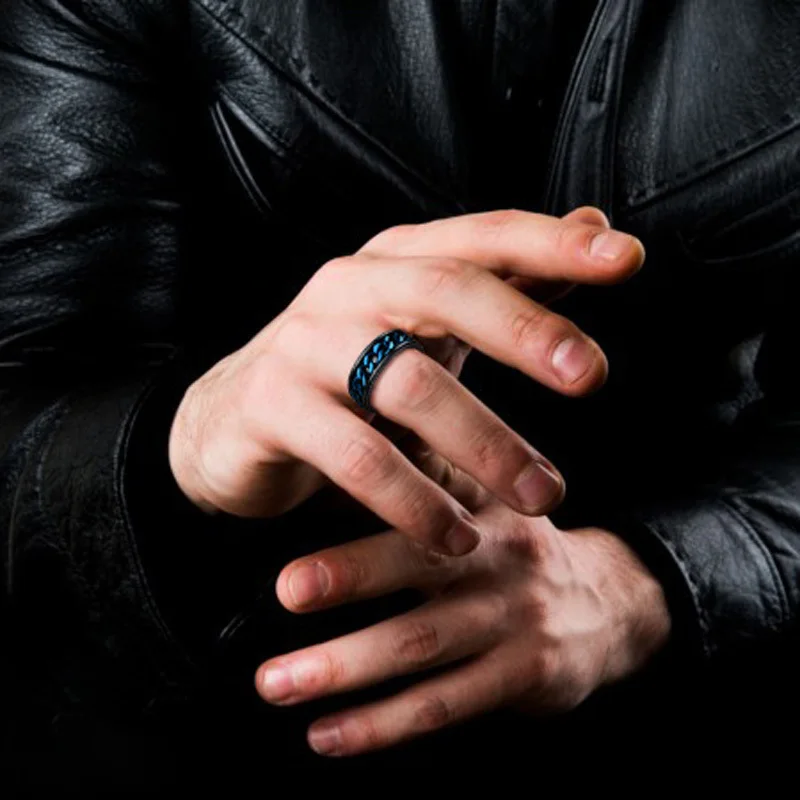 8mm Men S Fidget Black Rings With Blue Center Curb Chain Spinner