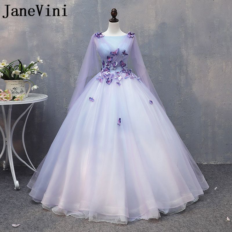 Janevini Light Purple Long Prom Dresses With Sleeves 3d Butterfly