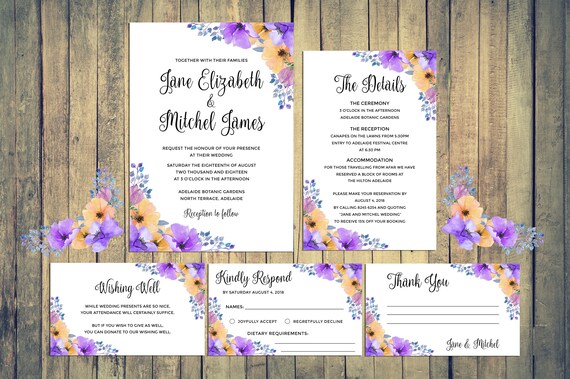 Digital Purple Orange Floral Wedding Invitation Set Etsy